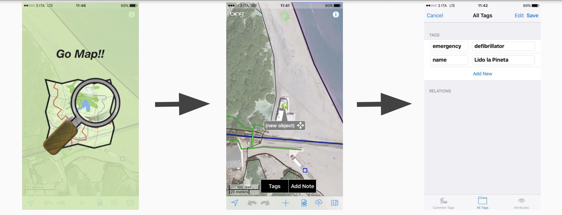 - Cliccare in basso “All Tags” e inserire i tags emergency=defibrillator e name=nome luogo.